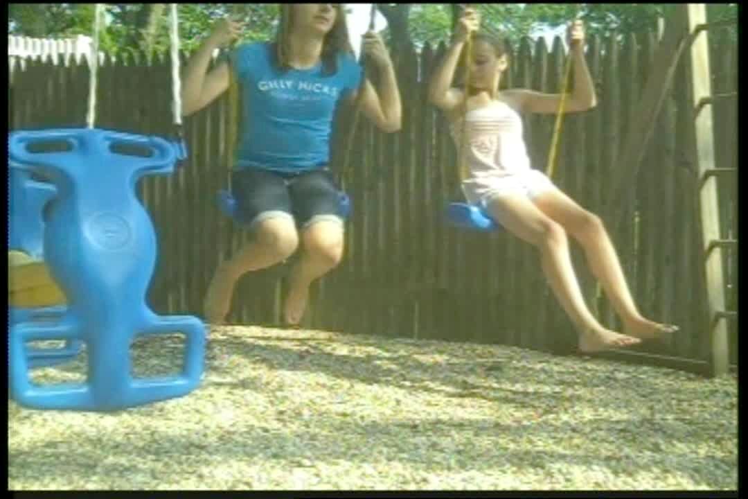 Teen girl tries to show sister how to flip out of swing at park, sister lands on head. Playground. Short tail.