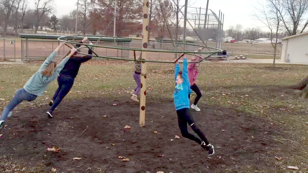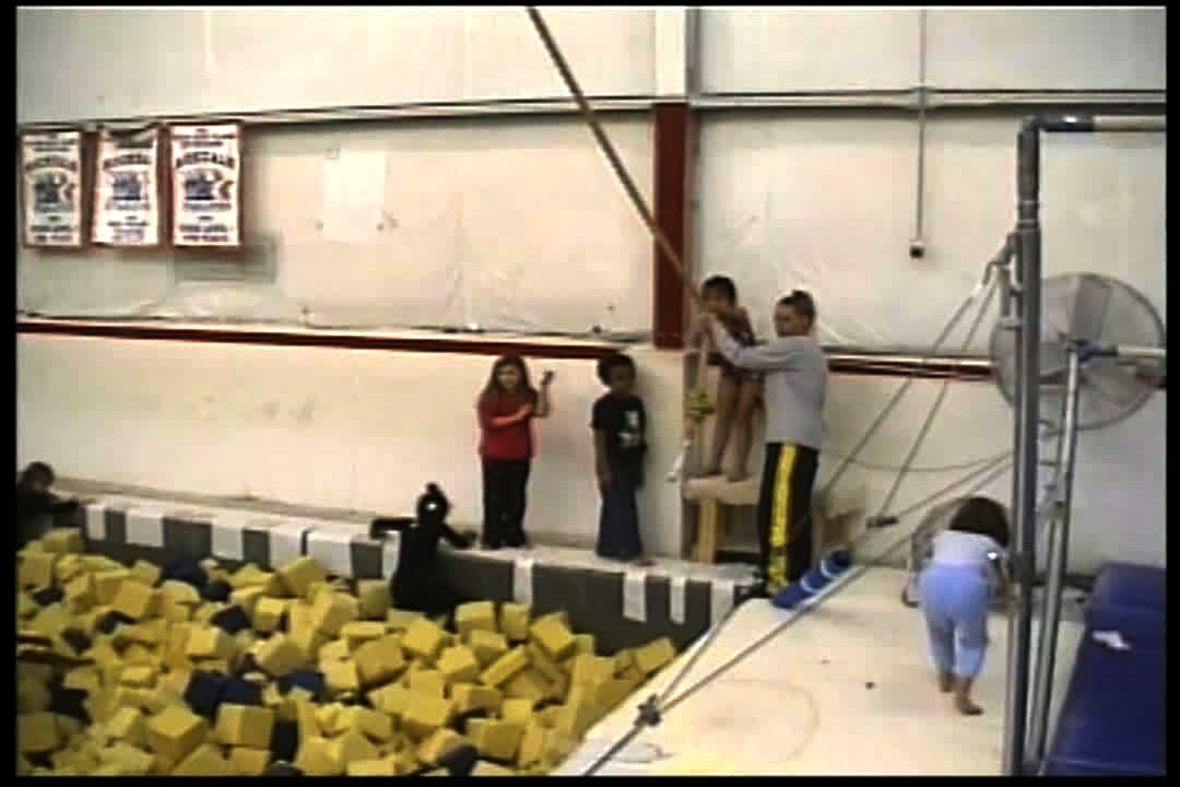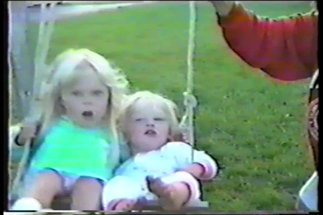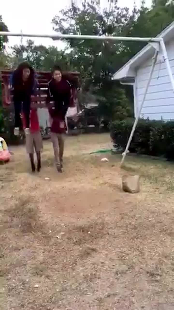 Two girls swing on backyard swingset, the whole thing falls apart and comes crashing down around them. With recovery. OC voice says "well I guess it's time to get rid of that"
