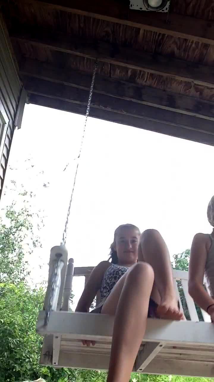 Two girls sit on a porch swing. Third girl jumps on the bench and it breaks. With recovery.
