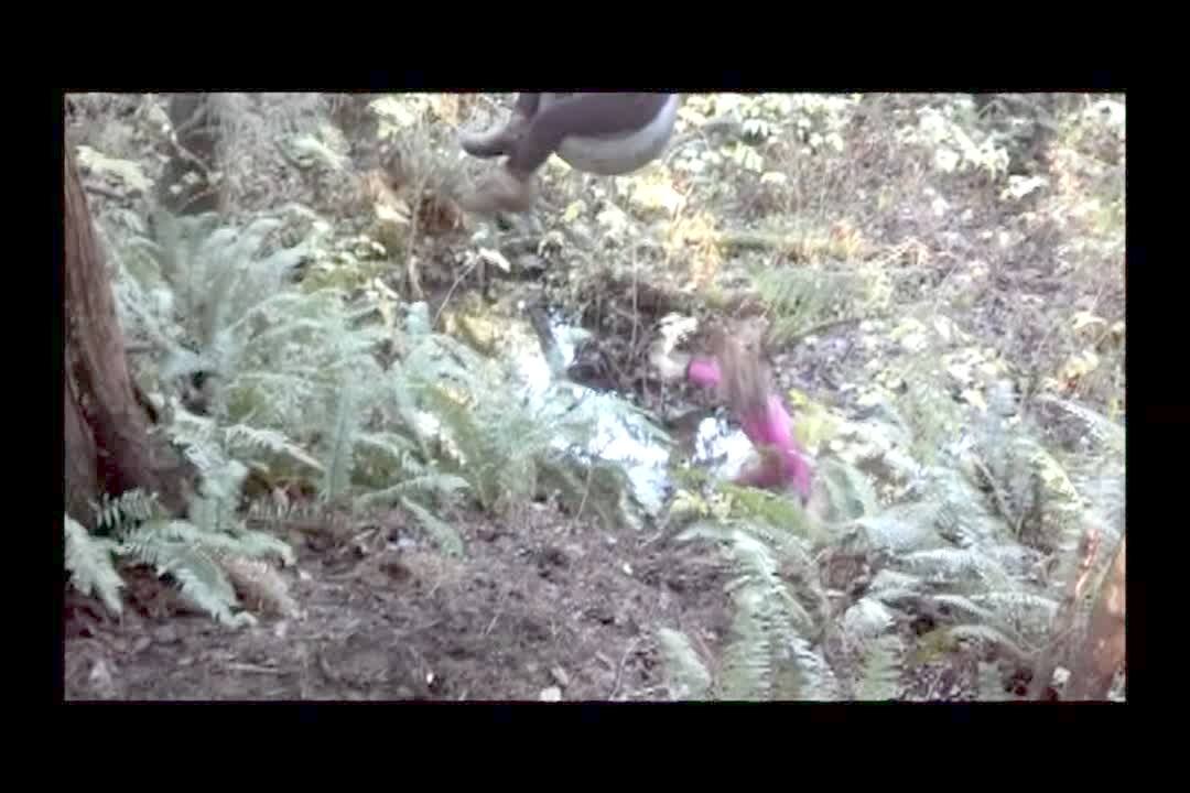 A teenage girl swings on a tire swing and knocks another girl into a creek.