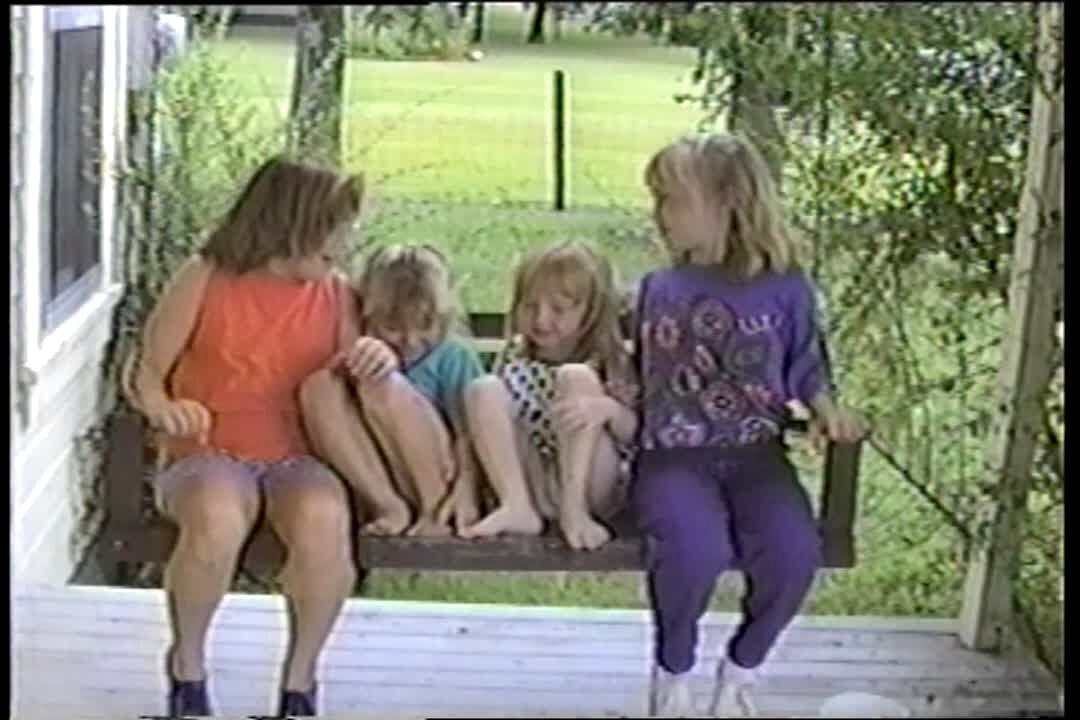 4 young girls on a porch swing fall when it breaks. Hard fall. (1323, 1602M, 1905)