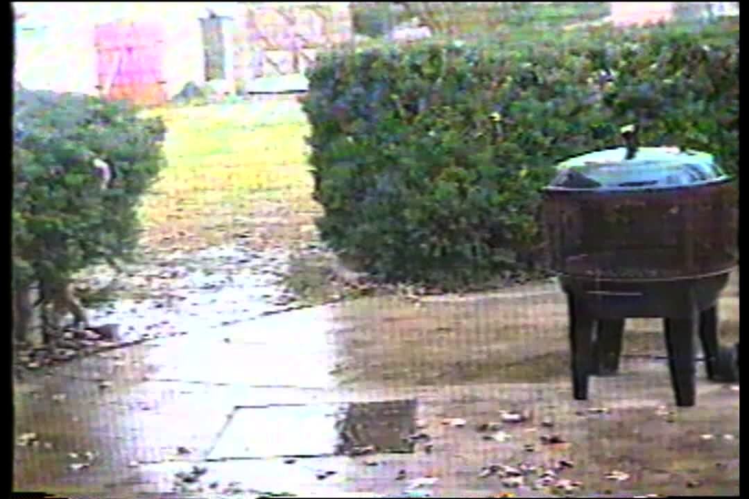 Tot girl stands outside near house and gets sniffed by a dog. Then the dog lifts its leg and pees on girl without her noticing. NO AUDIO.