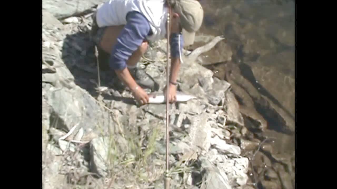 A woman falls in to a lake when she slips on loose rocks as she tries to grab a fish that flops away from her after she takes a hook out of its mouth.
