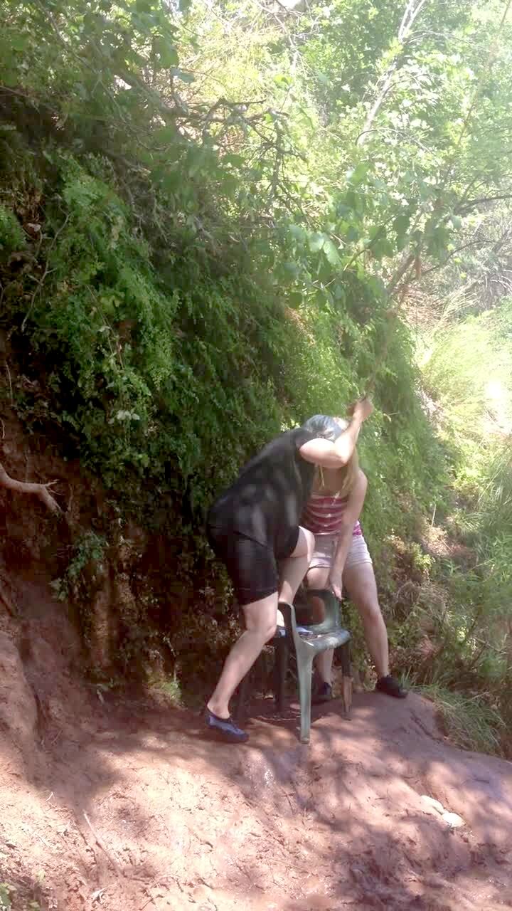 A woman tries to jump off a cliff into into a lake but she slips and falls in. Featured talent cleared only (woman who falls into the water).
