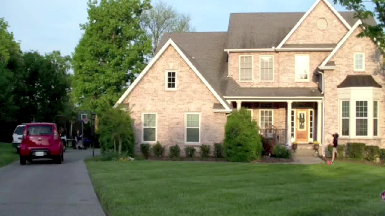 A boy throws a ball over a three story house and into a basket ball hoop outdoors. The boy standing by the hoop yells with excitement.