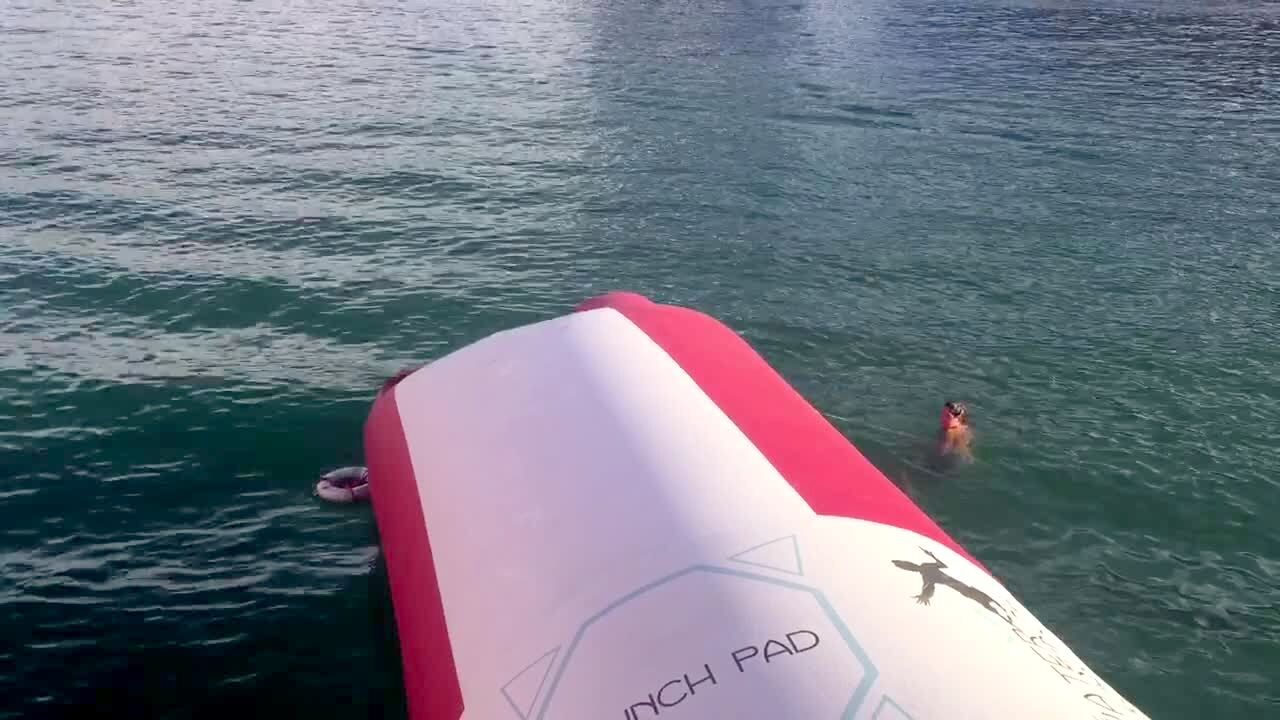 A woman pauses and shrieks before she falls short of what should've been a leap out onto the water as she belly flops in, instead.