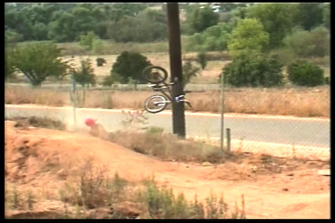 Young boy jumps over a ramp on his bike & falls. Bicycle flies into a fence & gets stuck. With recovery.