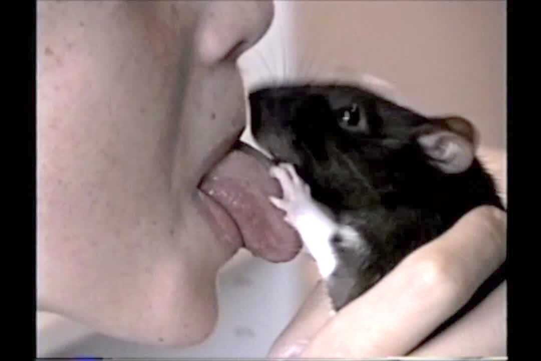 A boy allows his pet rat to lick his tongue and when prompted by his father, puts the rat's entire head into his mouth.