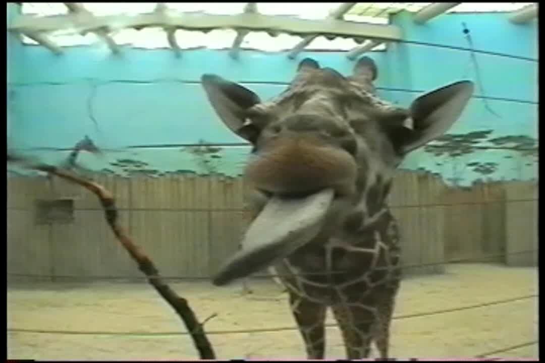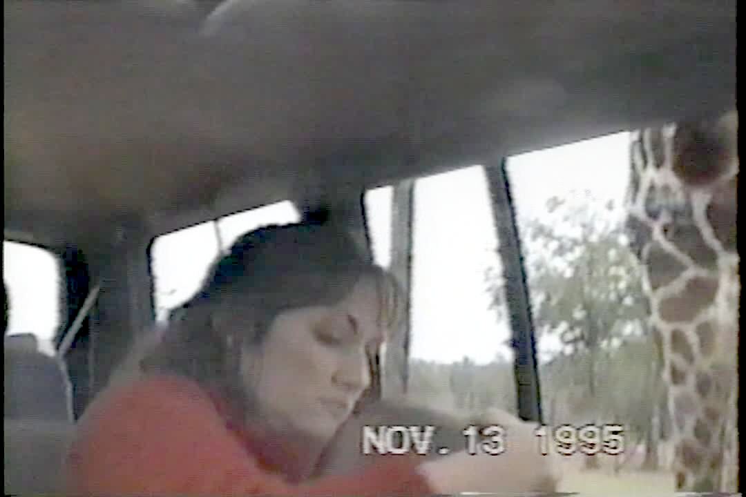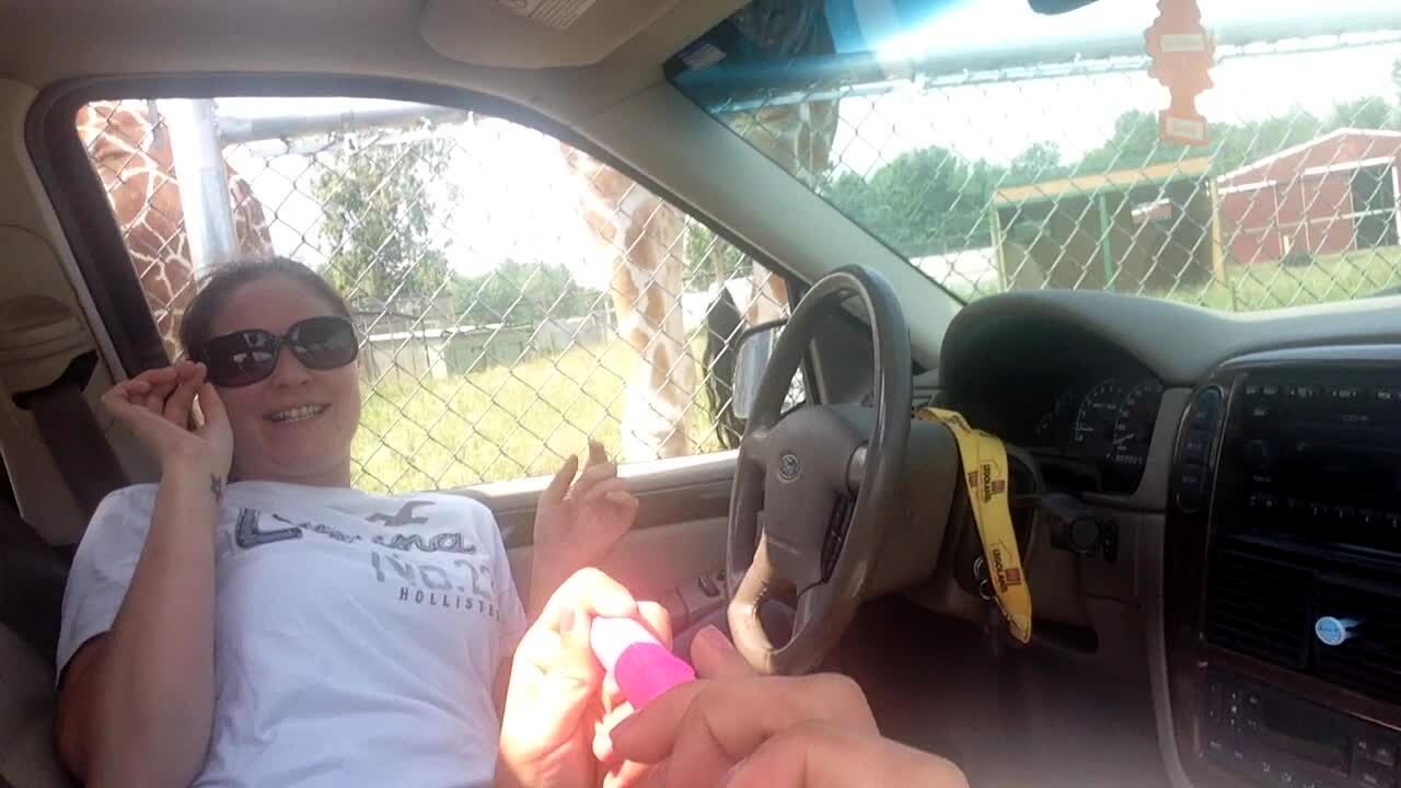 "Giraffe Gaffe" Woman feeds giraffe through a window/ sun roof of car at drive-through safari. Giraffe drools on woman and into car. Gross, mess. Zoo.