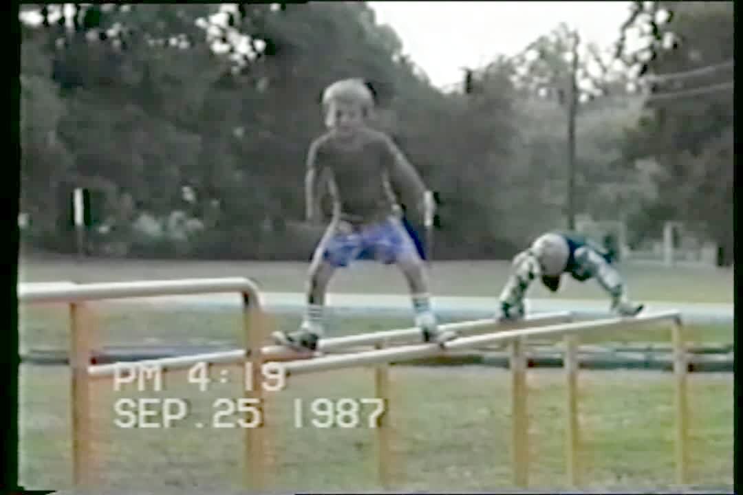 Boy jumps out from under a bridge on bike trail, he scares another boy on a bike. Scared boy falls off his bicycle, hits his groin on a wood post. The boys are cousins.