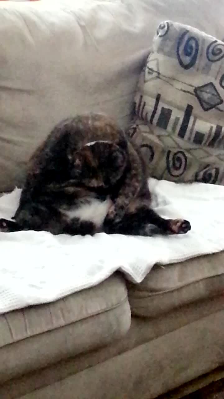 A large cat sits like a human on a couch and paws at her fat belly as she tries to clean under her fat folds.