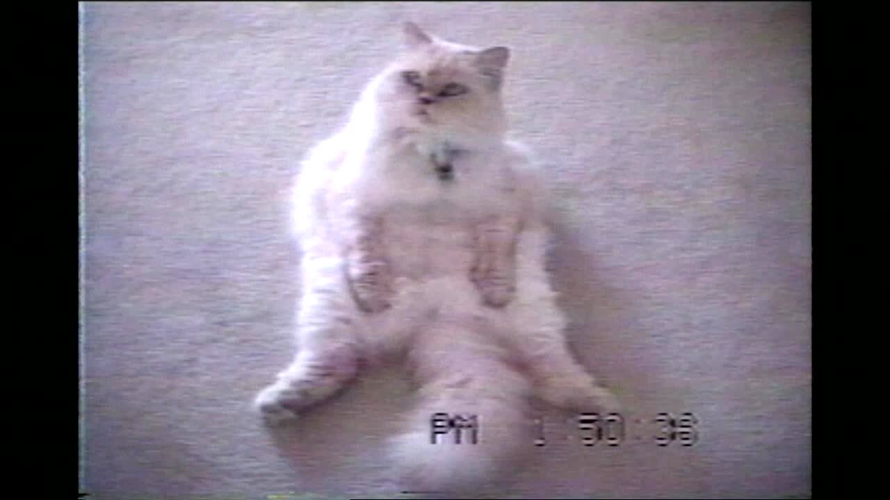 A fluffy cat sits upright on the floor like a human and casually wags his tail indoors.