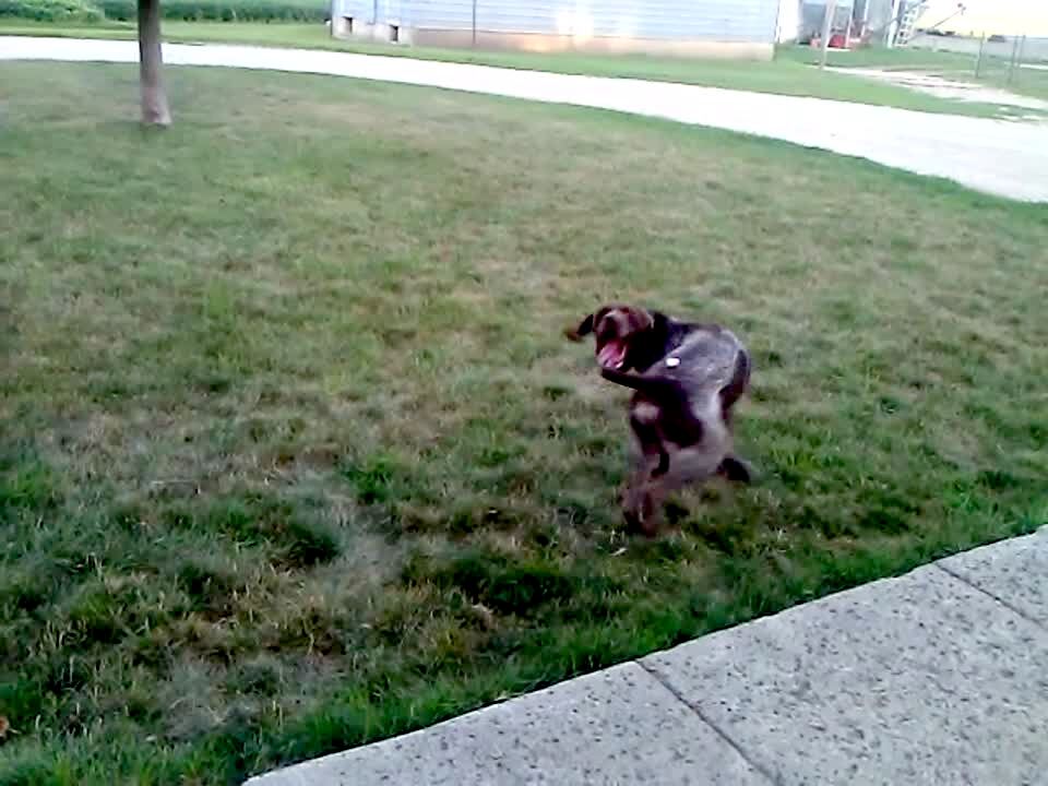 A puppy dog bites at a june-bug beetle outdoors until the bug gets stuck to her nose and she shakes her head frantically to get it off.