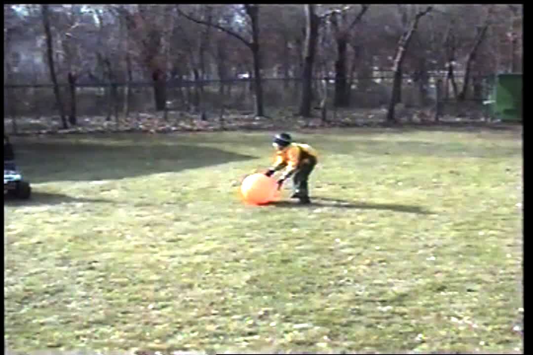 Boy puts a big ball in front of brother's toy Jeep. Boy runs over ball & flips the car over. Sibling rivalry.