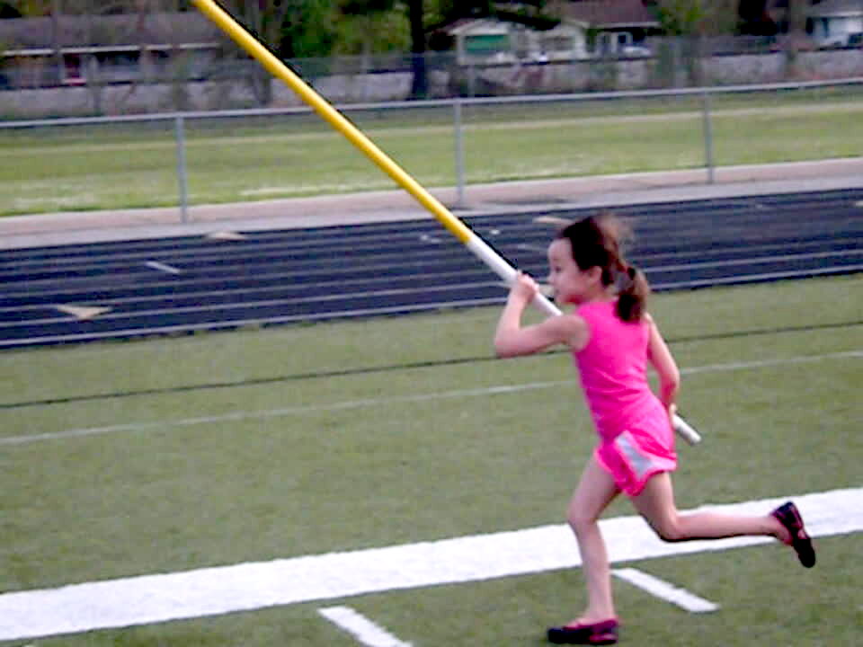 A girl runs with a pole and attempts to pole vault with it but just before she jumps a train horn sounds and causes her to jump and come to a stop.
