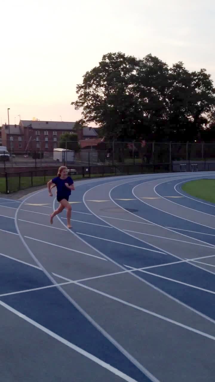 A teenage girl runs track outdoors and hits her leg and falls trying to jump a hurdle. Short tail.