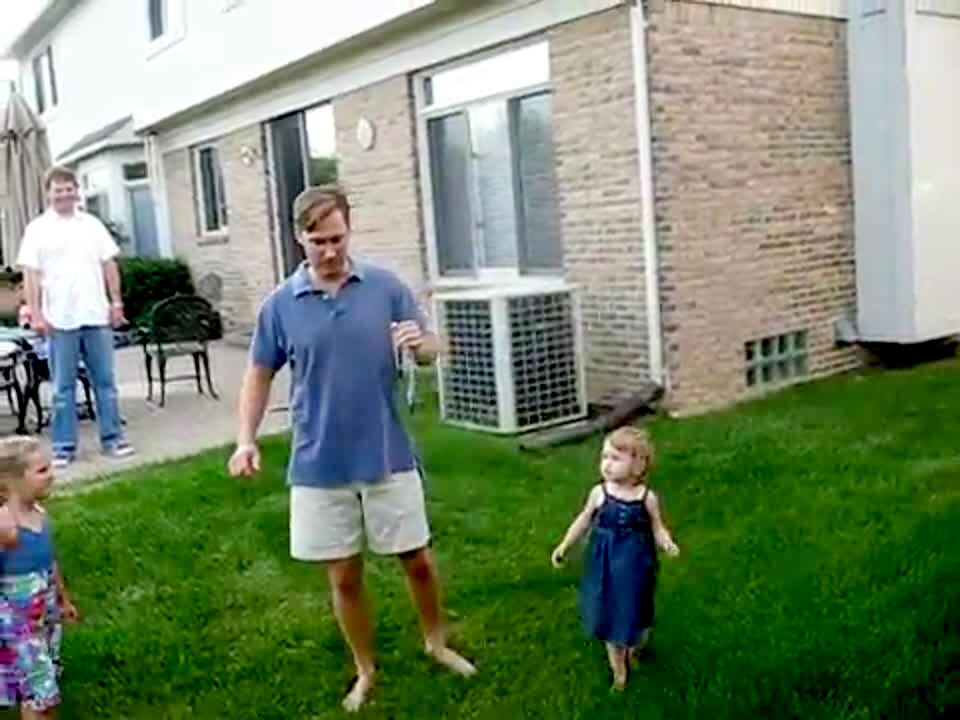Man in the yard with his 2 little girls tries out the electric fence to keep their dog there. He gets shocked.