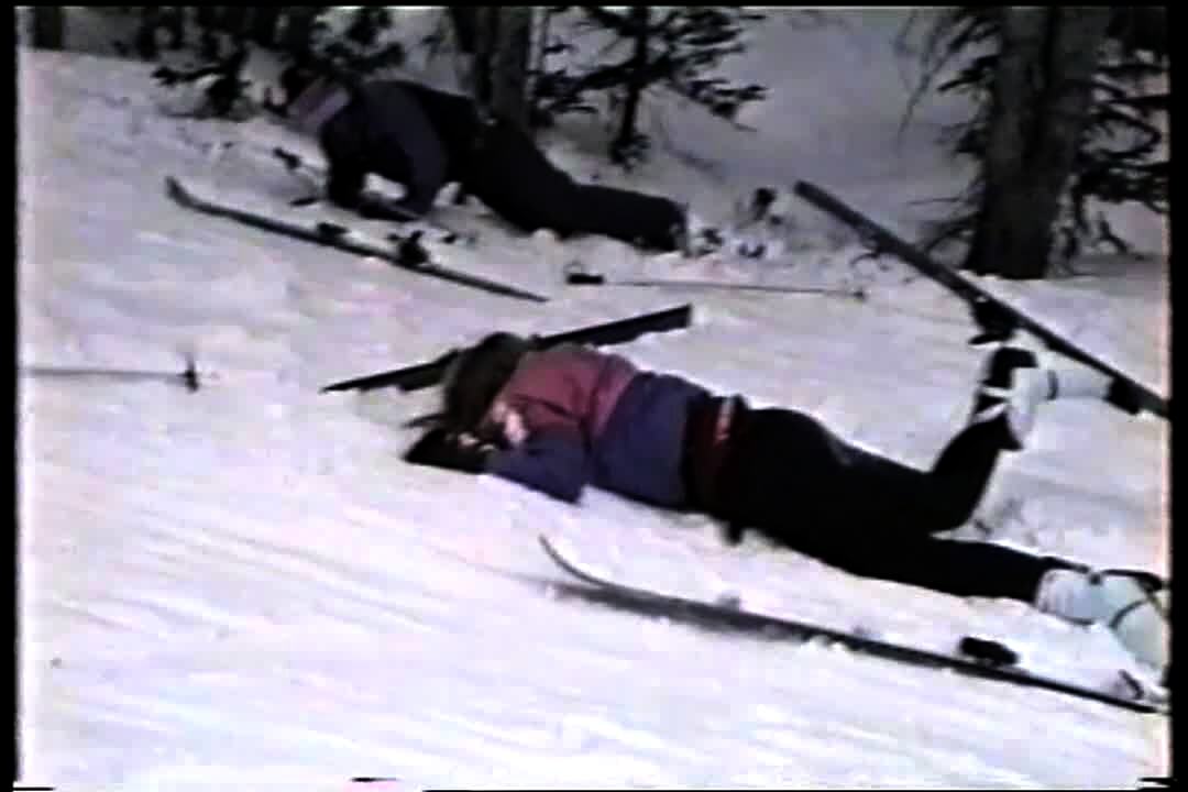 A woman in skis stands on a lift to take her up the slope, but she slips and falls and lays on her back the whole way up with her feet in the air. Another woman runs up the hill and helps her get off the belt.