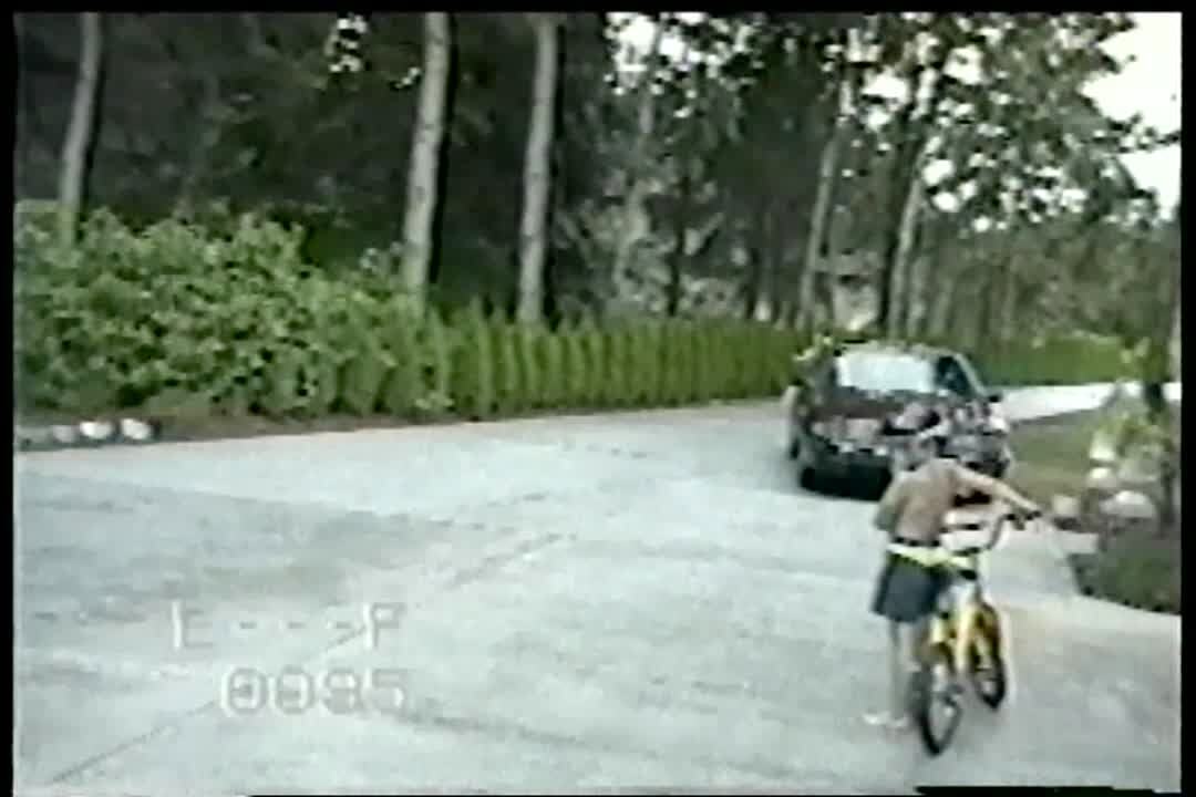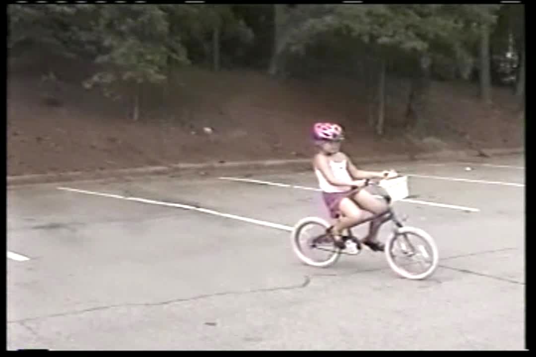 Girl learning to ride her bike is doing great. Then she rides straight into the back of a pickup truck for no reason. No tail - camera goes off girl, she cries.