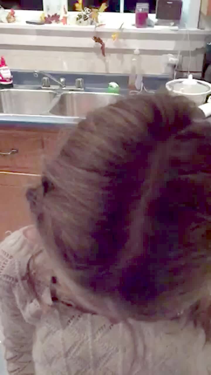 A young girl dumps a smoothie onto her face while she attempts to drink it in kitchen.