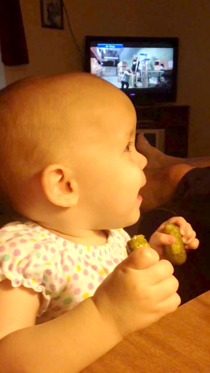 A baby girl gasps when she tries a taste of a pickle at home, then spits it out. Sour
