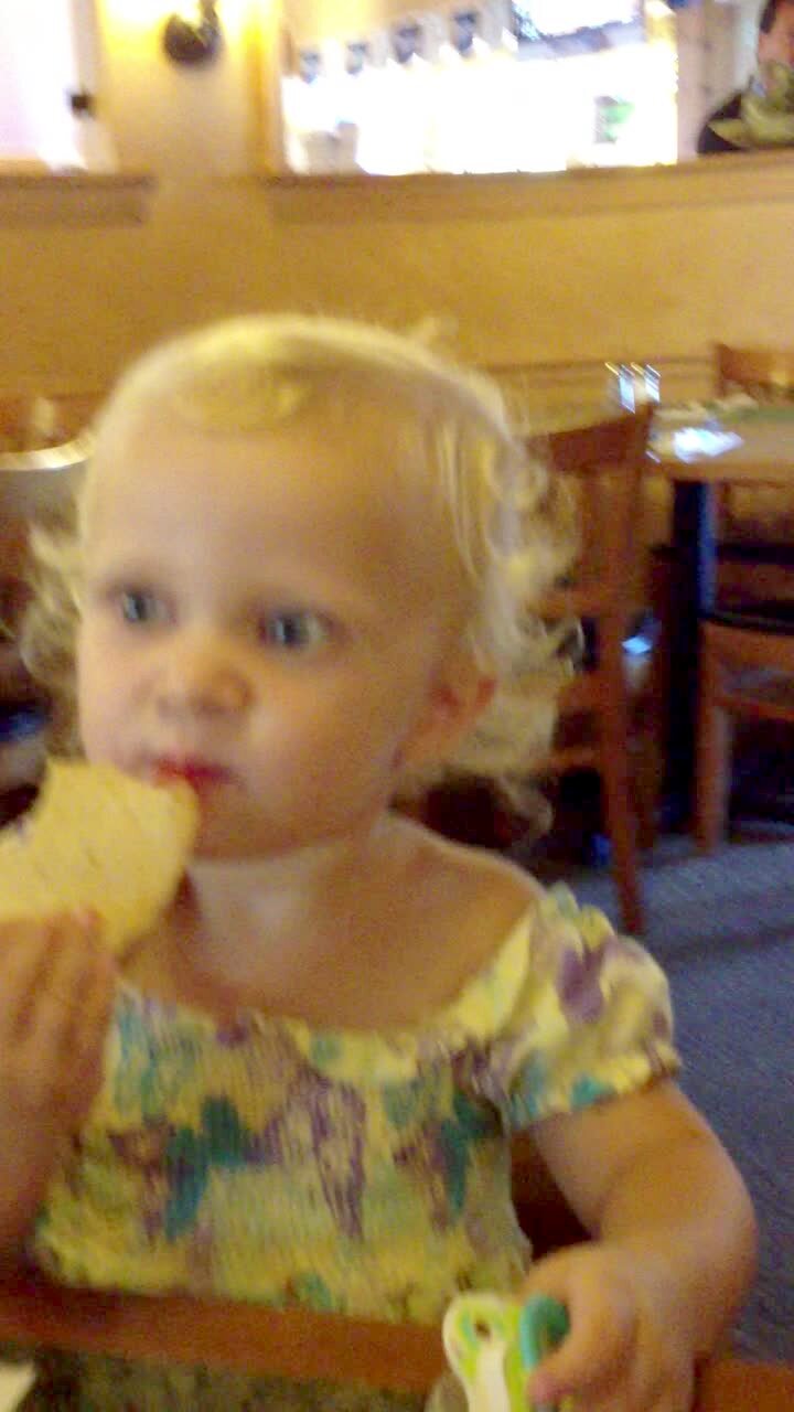 A tot girl sits in a highchair in a restaurant and makes a confused and then surprised face after she tastes a chocolate covered strawberry.