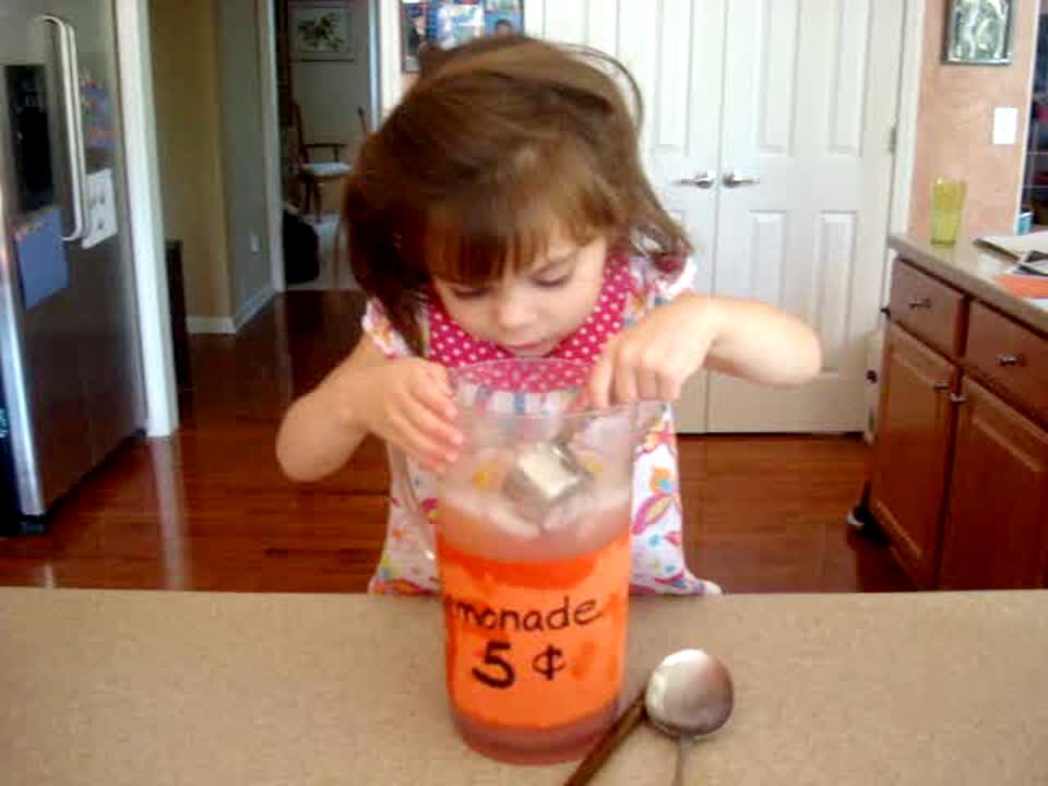 A tot girl drinks from a pitcher of lemonade at home, testing it before using it for her lemonade stand. She then takes a second sip, says, "Delicious!" and then spits it back into the pitcher.