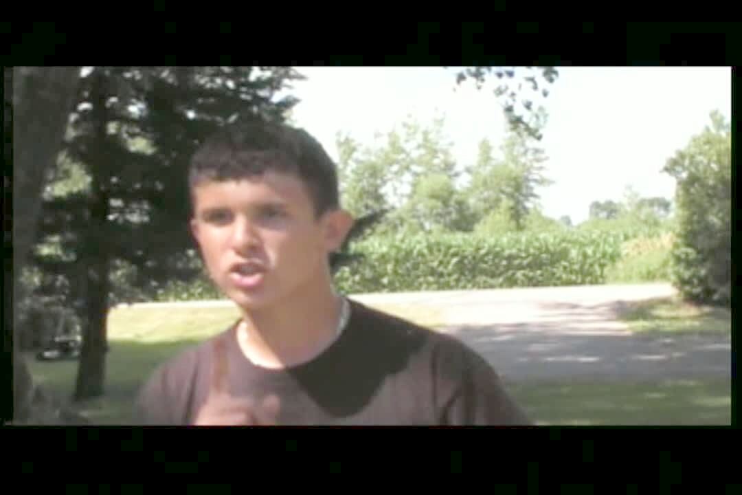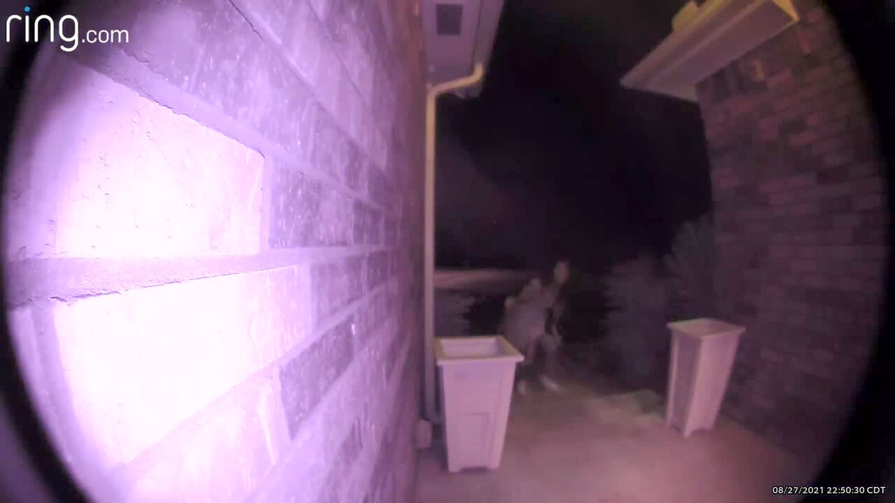 A teen girl walking out of the door notices a spider on her hand and gets scared. She screams then flies into the potter plant and says, "Oh, I'm bleeding bad" on the front porch. Security footage.