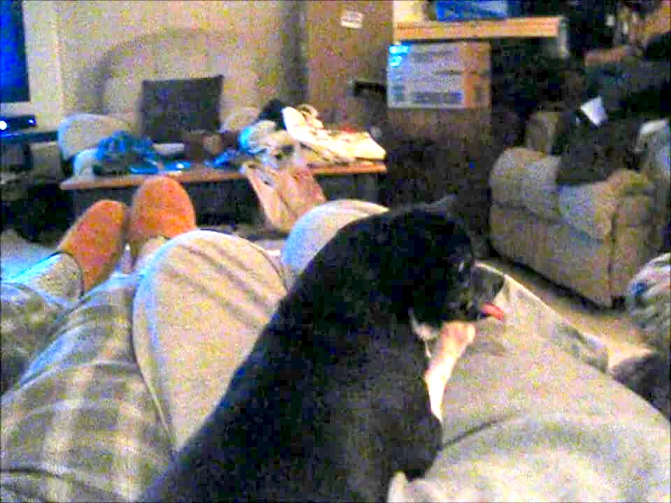 A small Chihuahua puppy dog runs around a man's head and neck while he sits in a living room chair. Featured talent cleared (the man).