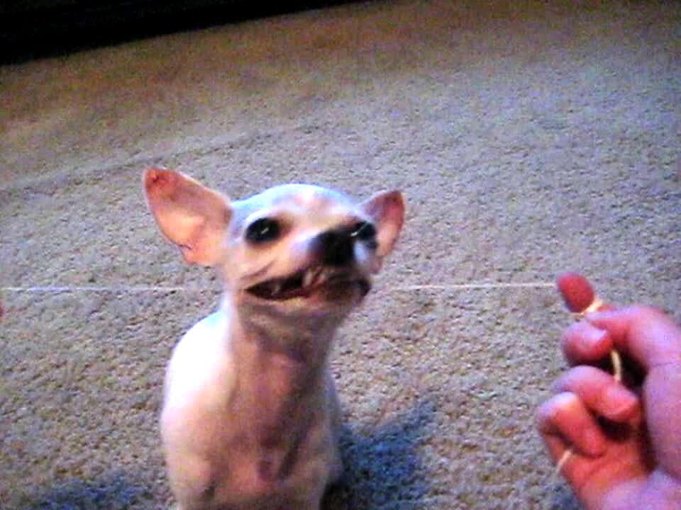 Brown chihuahua dog makes strange noise when man clips its nails in bathroom. Name that sound.