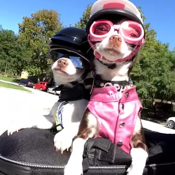 Two chihuahua dogs ride on the back of a motorcycle while wearing helmets and goggles.