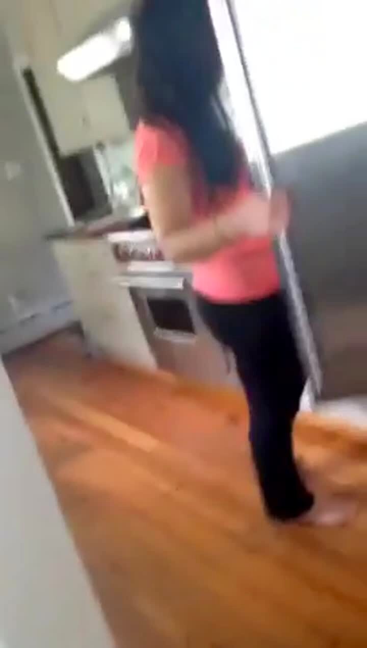 A chihuahua dog spins in circles as he goes down stairs indoors.