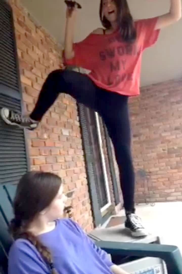 A teen girl dances on a trash can outdoors and falls on the ground when the lid breaks. A teen girl is visible.