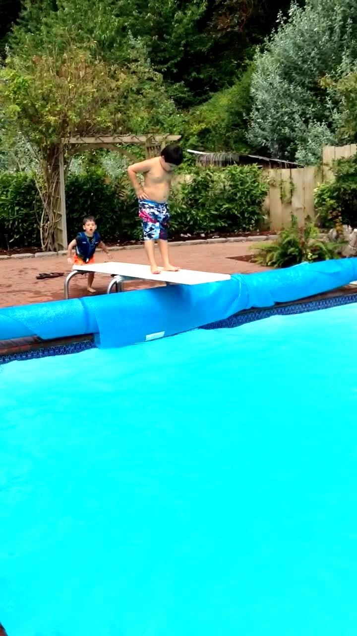 A chubby young boy runs on a diving board over a swimming pool outdoors, slips, hits his head, and falls in.
