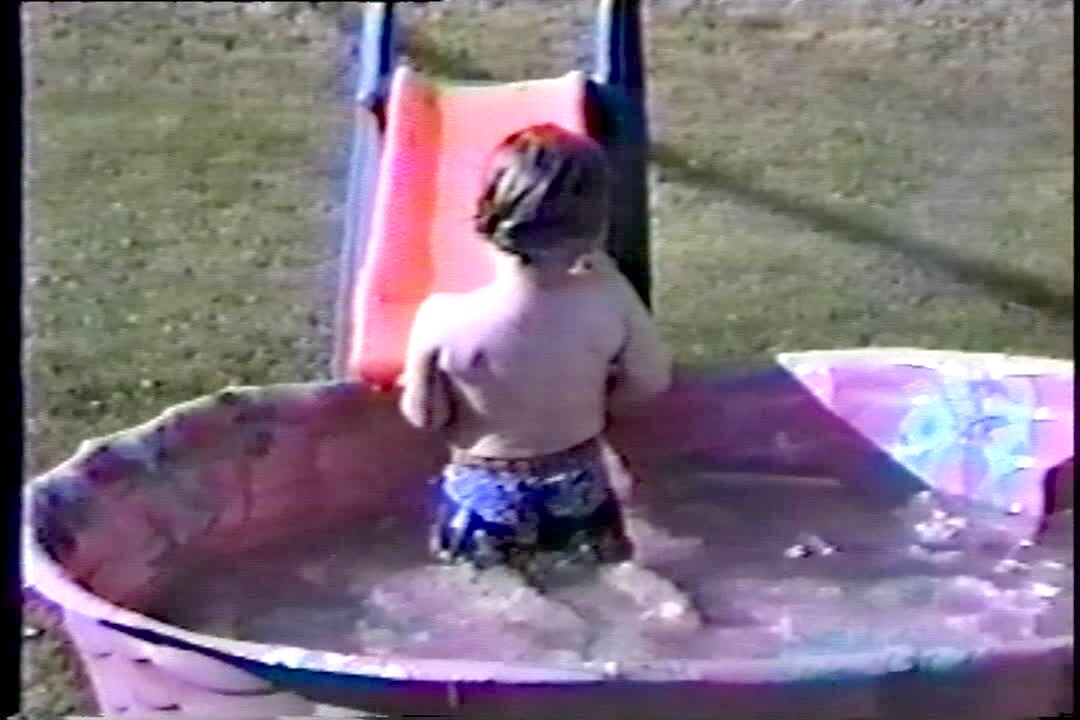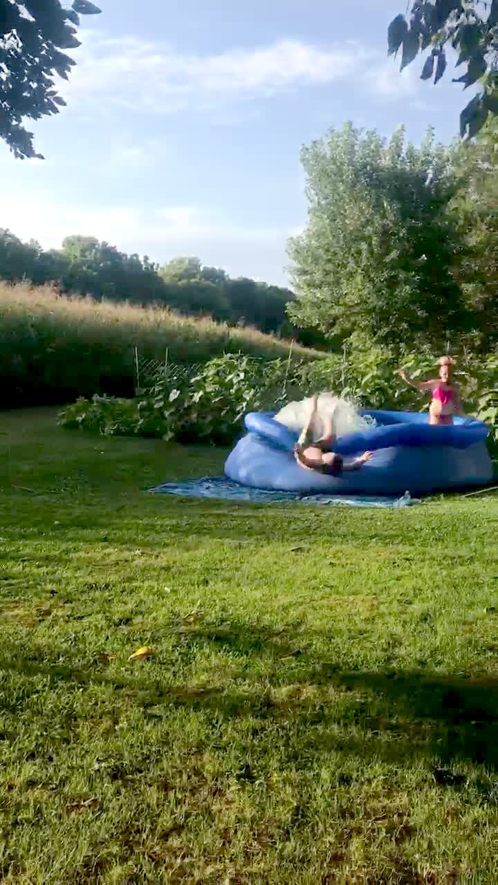 A young boy jumps into a kiddie pool in a yard, but he does a flip and falls on his face into the water.