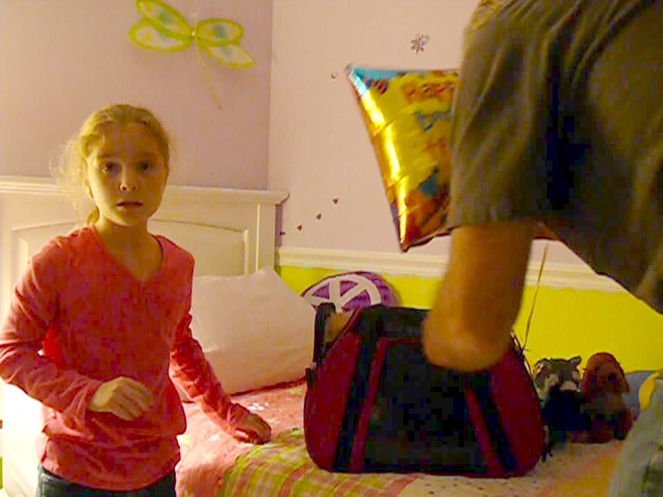 A young girl walks into her bedroom indoors and finds a backpack on her bed. She opens it, finds a puppy dog, and whines to her parents "Why did you buy me a real dog? It's not my birthday!" She picks it up and says "I didn't really mean that I wanted a real dog." "I'm not happy about this. Why did you have to buy me a dog?