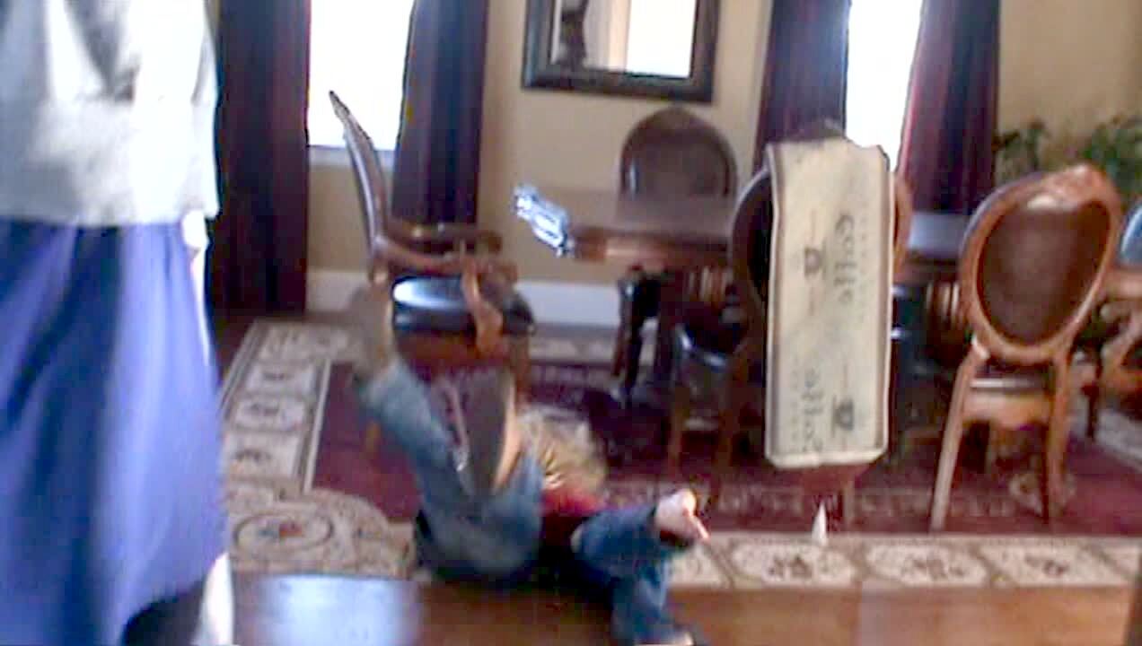 A young boy gives a young girl a Valentine's Day card and flowers. They hug each other and then fall over a single step that leads to the sunken dining room. They fall hard on the dining room floor and cry.