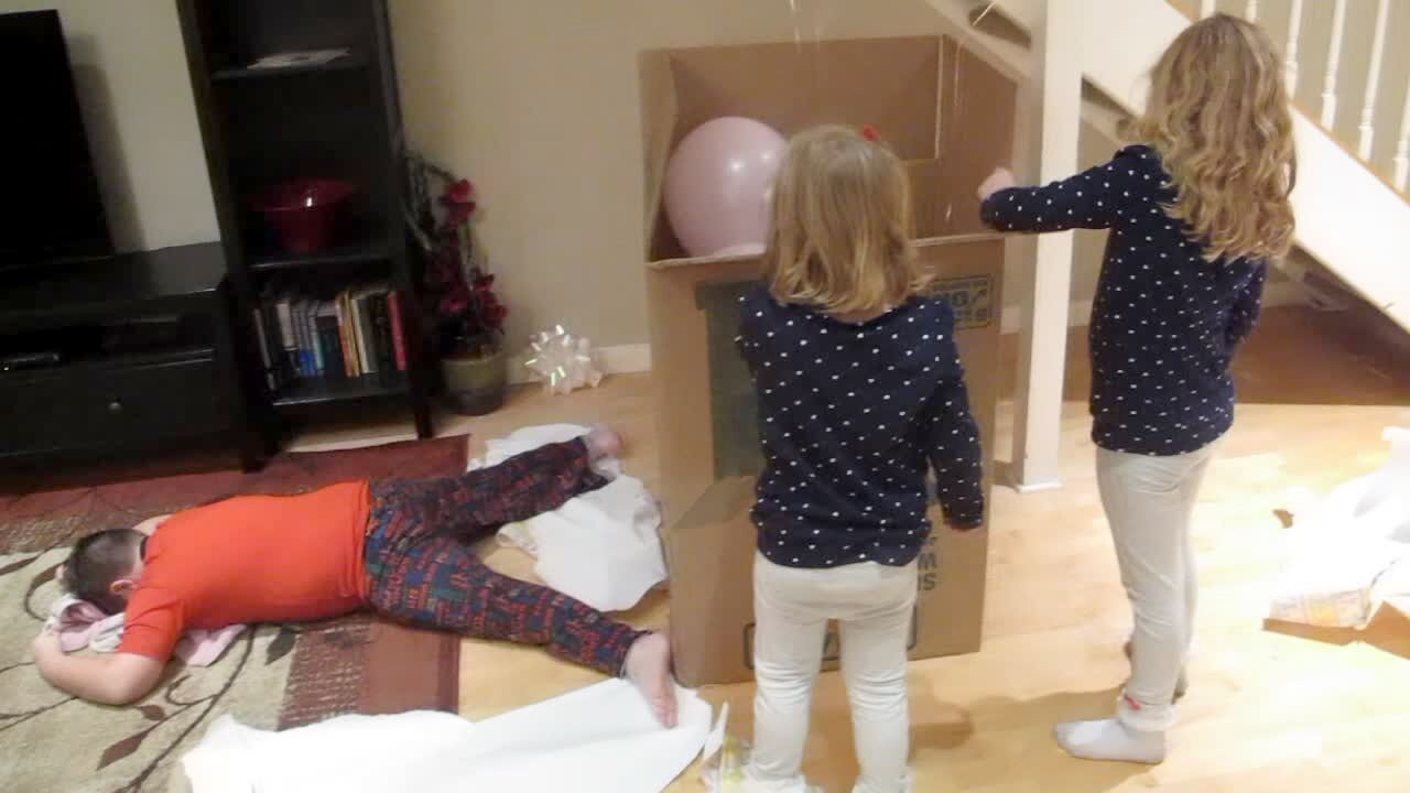 A boy and two girls open a gender reveal present for their future sibling. When they see that its a girl, the two girls celebrate while the boy cries and pouts indoors.