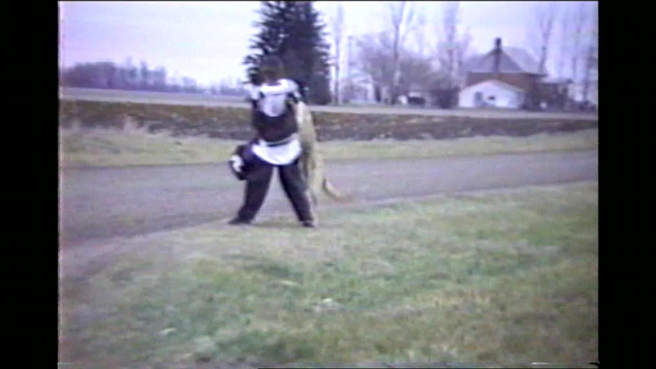 A young boy rides a tricycle down the street and sees a person in a dinosaur costume. The boy jumps off of his tricycle and runs away and screams as he says "get my tricycle".