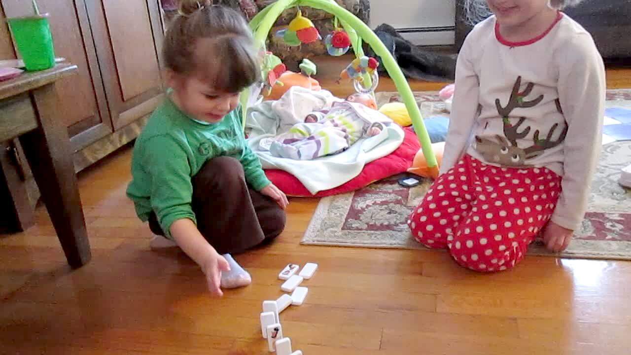 A tot girl tries to knock down a domino chain at home and individually pushes each one the wrong way.