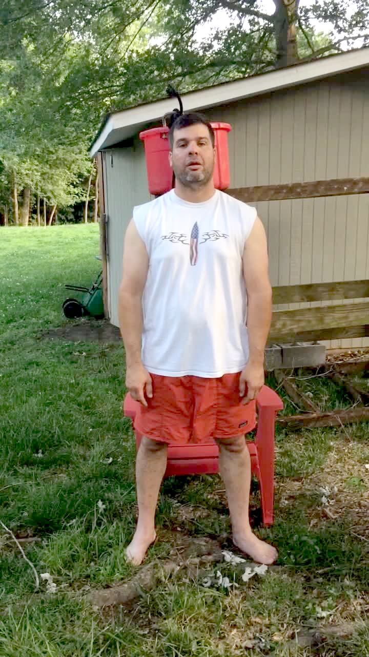 A man sits in a lawn chair outdoors and explains he's going to do an ice bucket challenge while a teen boy and a young man stand on a tractor behind him with a large metal tub of water. The man in the lawn chair pretends to read a newspaper as they struggle to tilt the tub of water, but when they do, it crushes the man and the camera cuts away but cuts back to show the man drenched on top of his broken lawn chair.