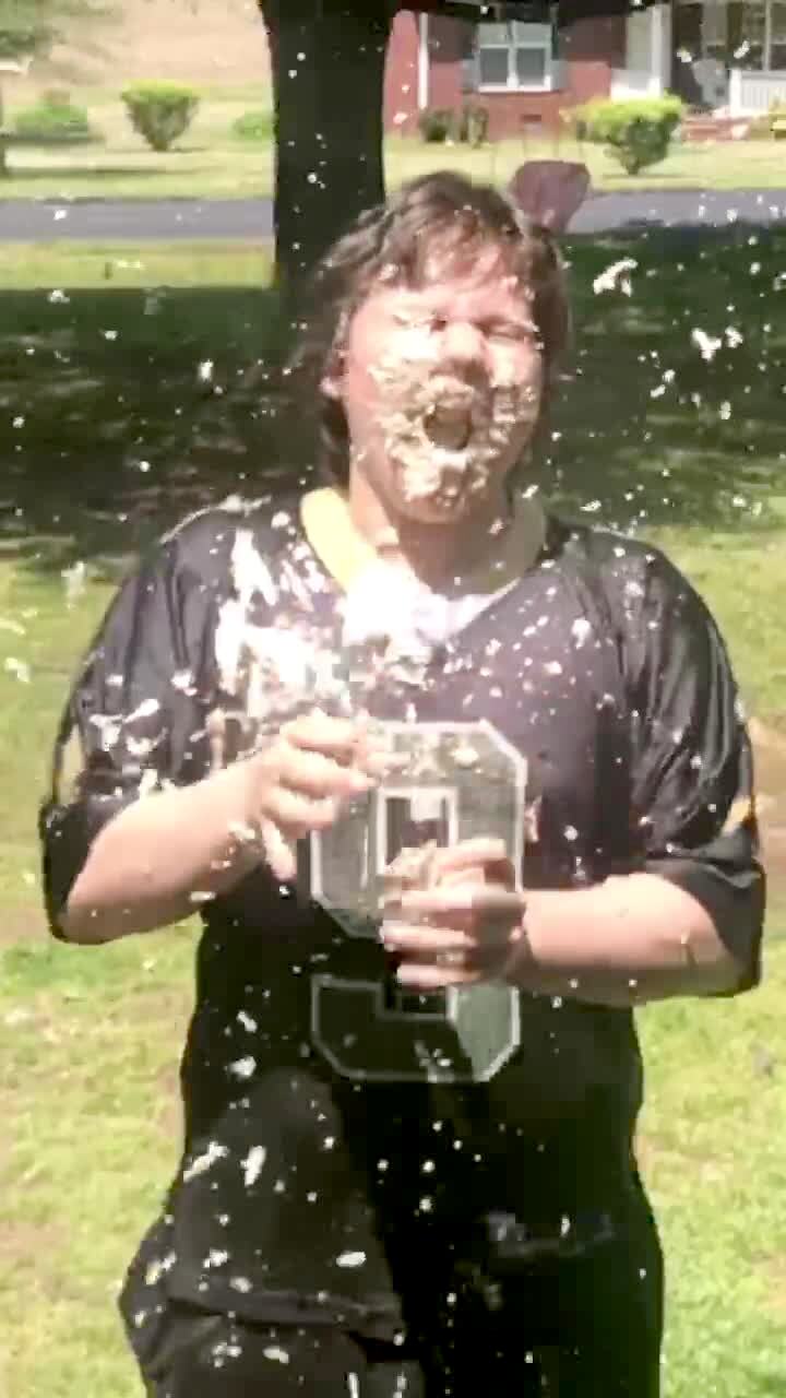 A teen girl lifts another teen girl onto her shoulders, but she drops her and the other girl's legs hit the glass door and breaks it.