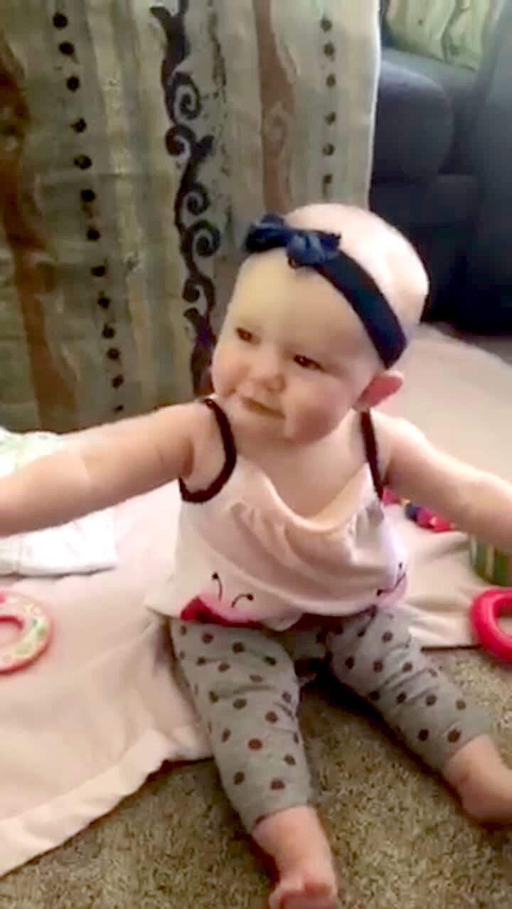 A woman asks her baby daughter to say mama. The girl says dada and laughs.