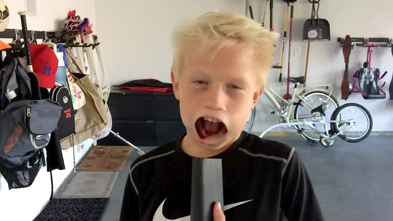 A young boy puts on an act while he knocks down a large icicle and breaks the whole drain off.
