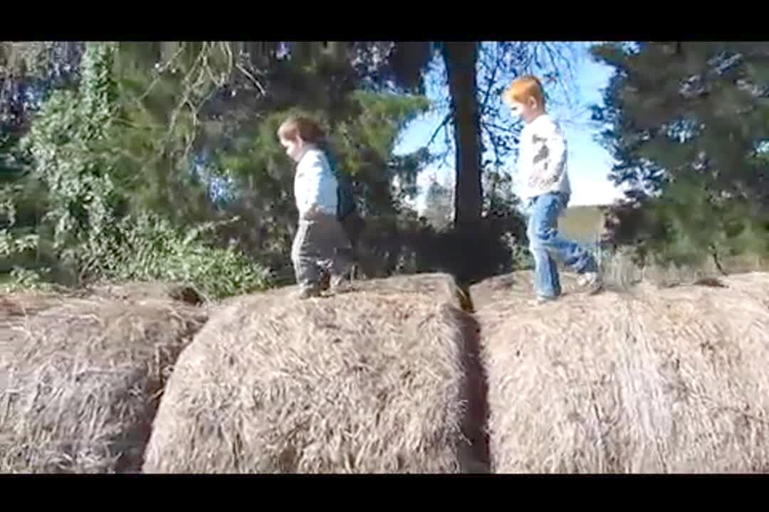 Two little boys walk along large hay bales stacks when one pushes the other down a crack. Short tail.