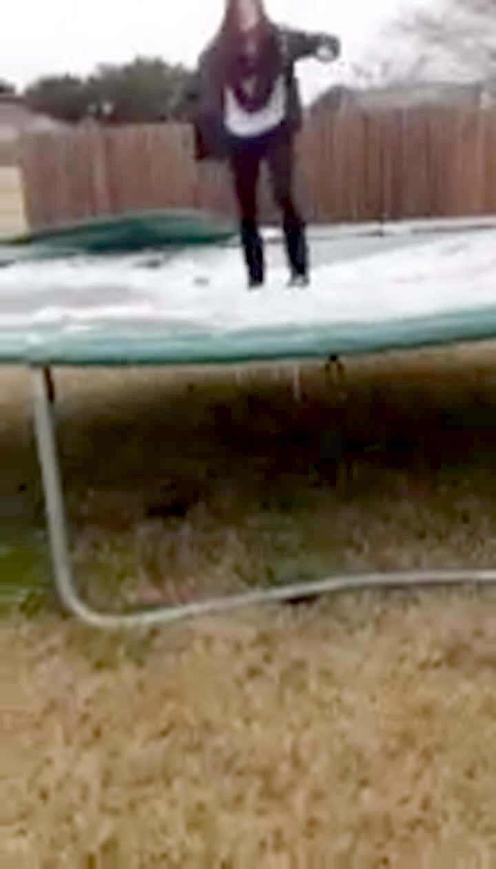 A teen girl jumps onto an ice covered trampoline outdoors and slips and falls when the ice explodes upwards.