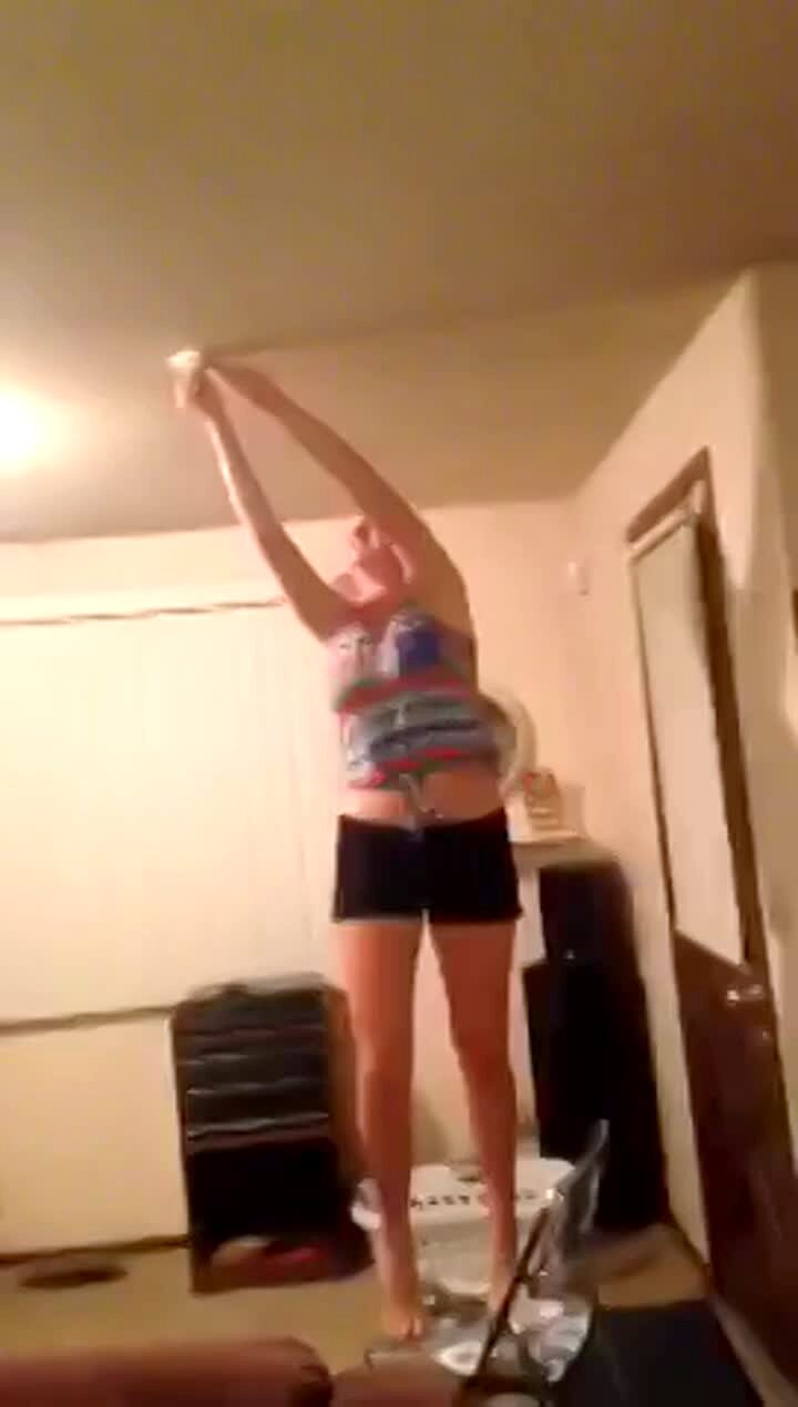 A woman screams when she kills a spider on the living room ceiling with a napkin, then falls off of the foldout chair she stands on when she loses her balance.