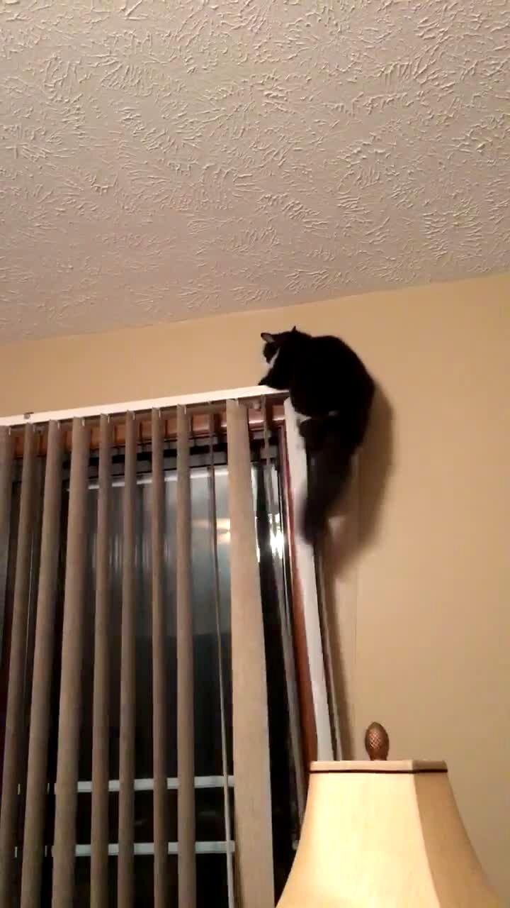 A woman gasps when her cat hangs off the rail that holds the blinds up in the living room after the plastic rail guard falls when the cat slips.