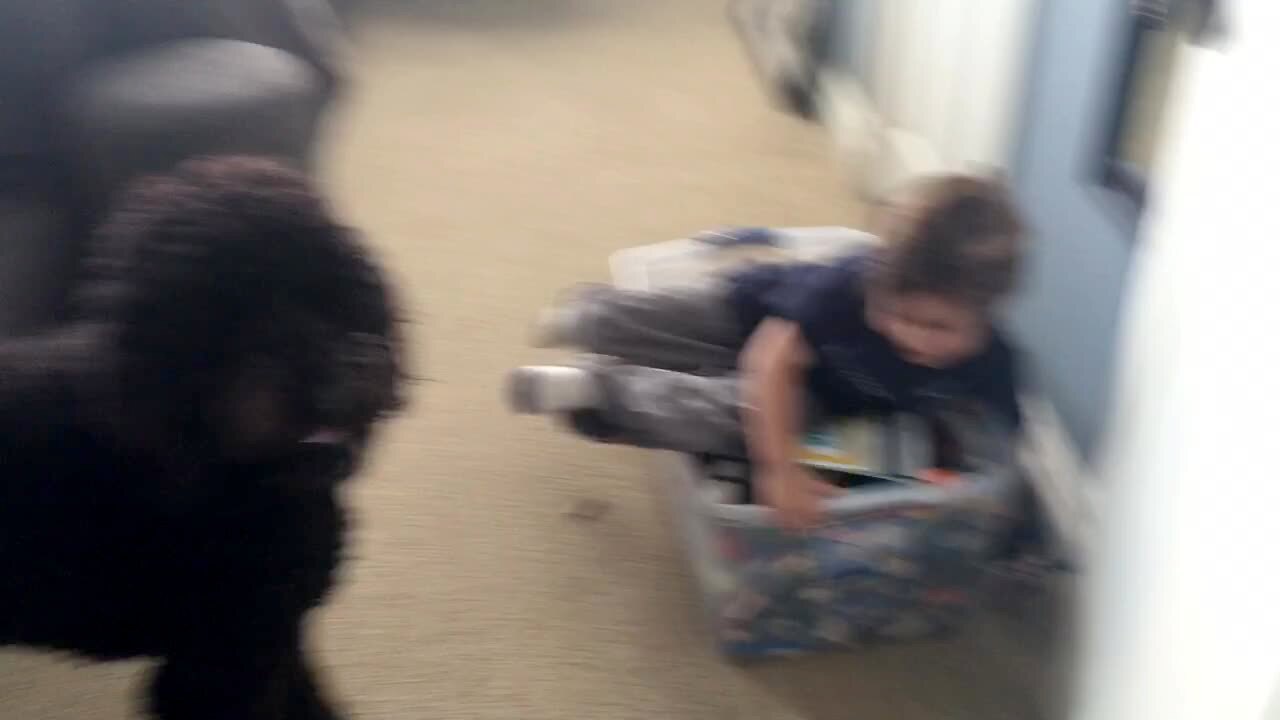 A young boy falls in to a storage container of toy in a bedroom when a dog lets go of a rope toy as they play tug of war.
