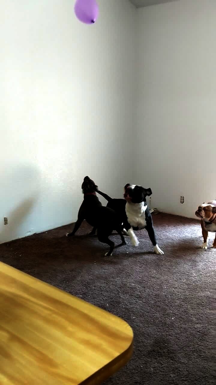 Two pitbull dogs jump in the air and repeatedly hit a balloon with their noses to bounce the balloon in the air until they both fall on the floor after they jump in the air at the same time and pop the balloon.